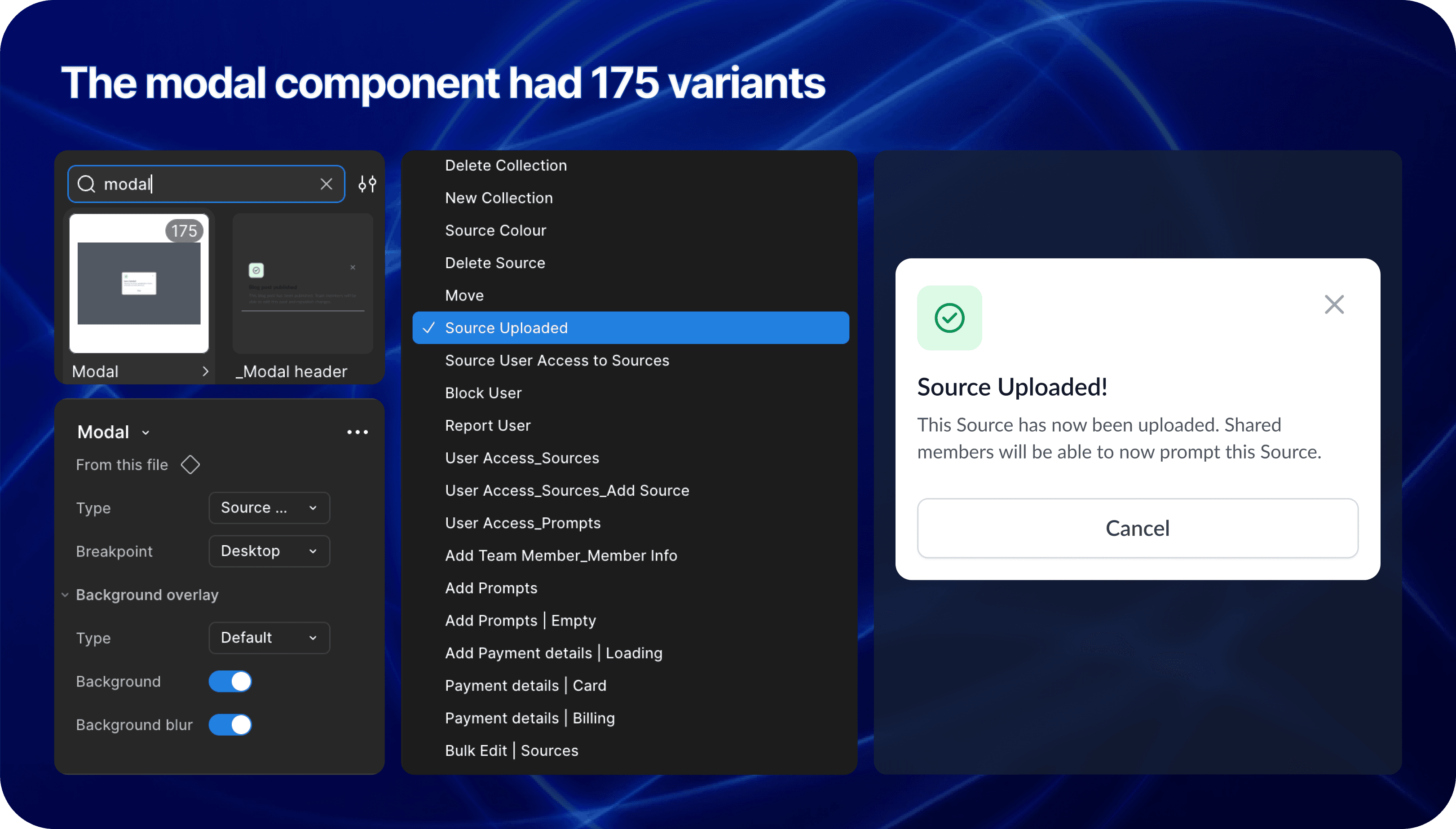 The Component Trap: Instead of a scalable modal with variant properties, we had a new variant for every single scenario.