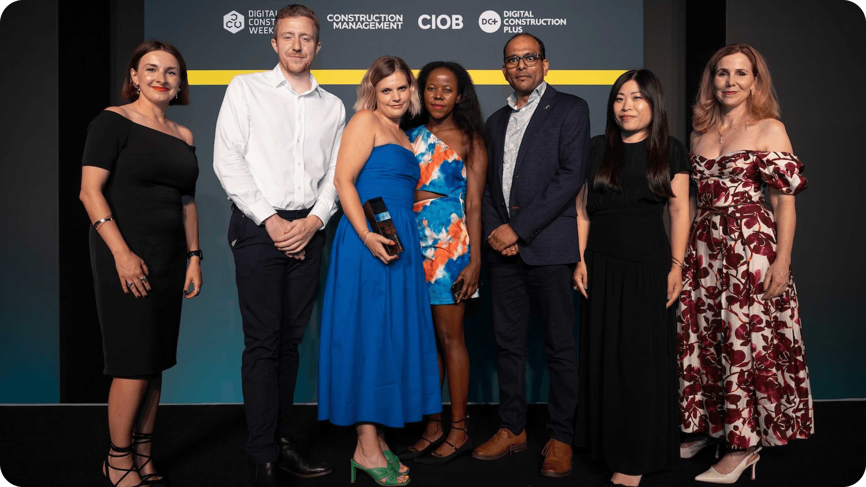 The BuildPrompt team collect their trophy from Karolina Orecchini of Digital Construction Week (far left), Lilian Ho of Aecom (second right) and Sally Phillips (far right) (Photo © 2025 – ASV Photography Ltd. www.ASVphotos.com)
